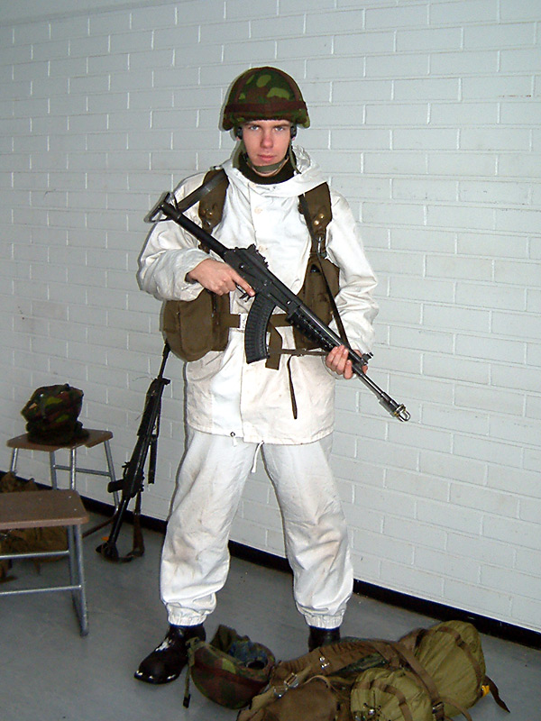 Первый день практического боевого обучения (taistelu-koulutus). Из казармы вышли облаченными по полной программе, поверх зимней одежды белые маскхалаты, за спиной разгрузка с котелком, дождевыми курткой и штанами, противогазом и комплектом нижнего белья, на голове каска, в руках штурмовая винтовка. Встали на полигоне по колено в снегу и начали отрабатывать как правильно на землю падать, как стрелковой цепью (avorivi) и змейкой (avojono) ходить. Затем пришло время продвигаться вперед перебежками, пригнувшись и, на случай если в бою станет совсем жарко, ползком. Ворочаясь в снегу расколол себе ствольной коробкой винтовки передний правый резец — уголок зуба распался на несколько обломков и потерялся в снегу.