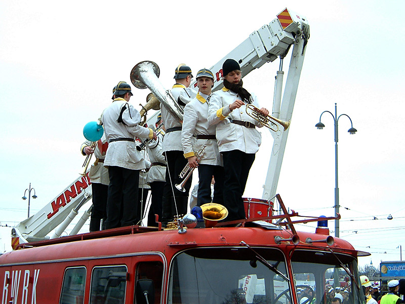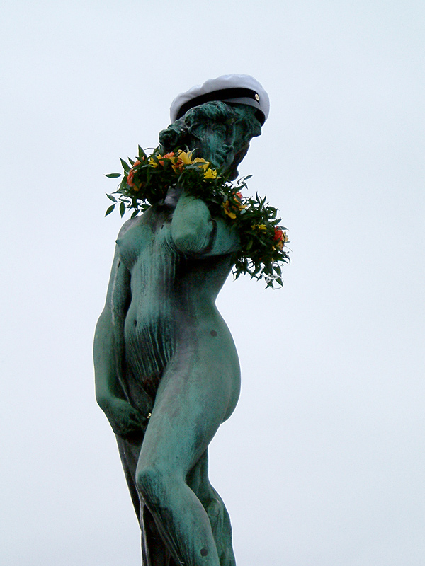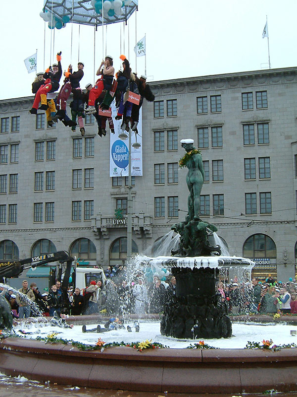 В шесть вечера всё готово. Духовой оркестр, оседлав пожарную машину, оглашает площадь нестройными звуками, в фонтане плескаются водолазы, а на стреле крана в воздух поднята карусель студентов со специально пошитой фуражкой гигантских размеров. Как только она оказывается на бронзовой голове статуи, толпа белеет от тысяч надеваемых фуражек. На этом официальная часть церемонии завершается. Люди рассасываться по боковым улицам. Напоследок, при желании, можно пробиться к самому фонтану и угостить водолазов шампанским.
