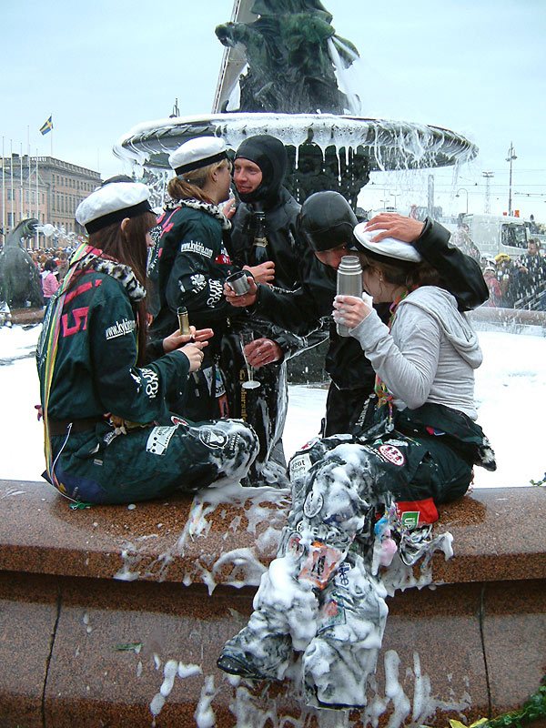 В основной массе это студенты, наряженные в разноцветные комбинезоны. Каждое высшее учебное заведение, а порой и отдельные факультеты этих заведений, имеют свой цвет, что упрощает нахождение в толпе «своих» и «чужих». Скажем, в моём Хельсинском технологическом университете «механики» с давних пор соперничают с «электриками» и если одинокая розовая фигура забредёт в окружение «белых», то, наверняка, услышит в свой адрес несколько безобидных поддевок. Комбинезоны принято украшать. Для этого подходит всё, что можно пришпилить, приклеить или пришить к ткани. Особой популярностью пользуются значки и тряпичные эмблемы, купленные на месте событий и мероприятий, на которых побывал студент. Если на рукаве видна не однажды залитая пивом нашлёпка с надписью «Первомай 1999», то сразу становится понятно, что её обладатель не первый год полирует деревянные скамьи родной альма-матер. Кроме молодёжи, в толпе можно встретить много людей постарше, даже древних бабушек, за которых становится страшно в давке первых рядов. Их фуражки чаще всего старомодного фасона и пожелтевшие от времени.