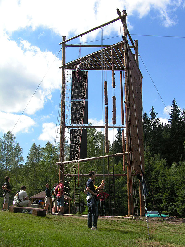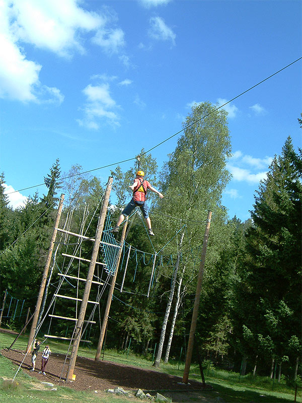 Тренировочная база находилась в городе Харрахов (Harrachov). Так что железнодорожное путешествие было продолжено на мотовозе. Четырёхчасовая программа была организована чётко и понятно. Поначалу мы делали простые упражнения на координацию и учились группой решать задачи, такие как преодоление трёхметровой стены без подручных средств или балансировка плечей качелей. Более сложным оказалось перемещение по натянутому тросу, имея в распоряжении разнообразие свисающих сверху канатов. На третьем этапе мы переместились на тренажёр, где канаты были натянуты на высоте от 3-х до 8-ми метров. Тут уже понадобилась не только хорошая координация, но и физическая сила. И, наконец, последний час мы провели взбираясь на вертикальную 12-ми метровую стенку, качающиеся брёвна с выступами, верёвочную лестницу и плетёную сеть. Напоследок нас побаловали скоростным спуском по канатной дороге.
