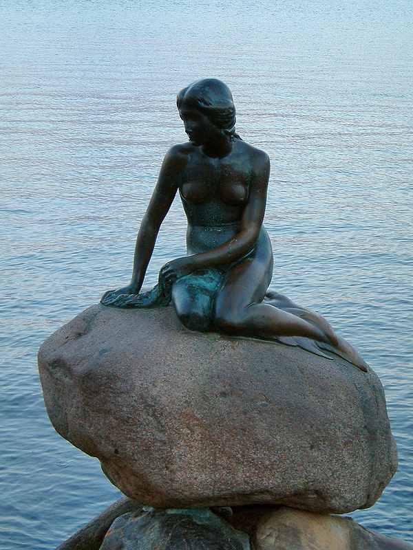 Den Lille Havfrue (Русалочка). Символ города. Вандалы несколько раз отпиливали ей голову, один раз руку, многократно раскрашивали бронзу красками, однажды вообще сбросили статую с постамента в воду.