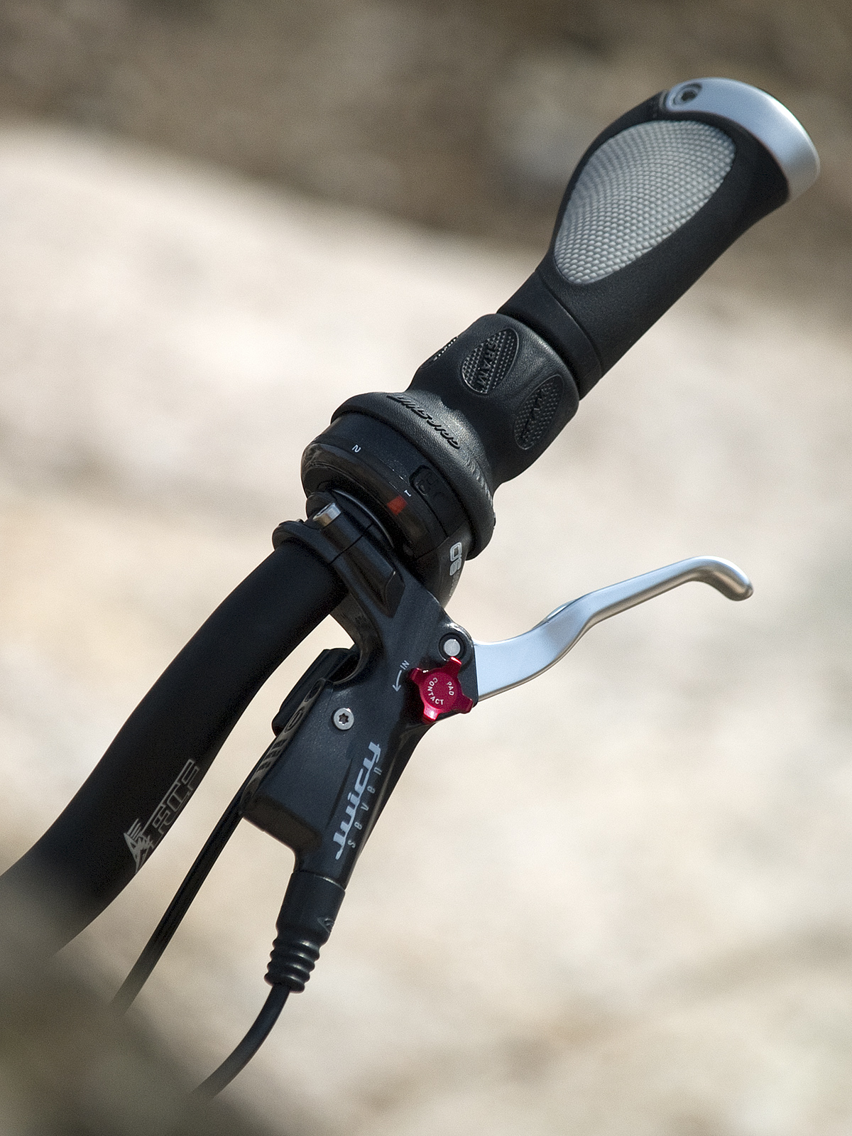 Дальше я обратил внимание на тормоза. Впереди стоял гидравлический Hayes HFX-9, сзади — гибрид из механического Hayes MX-2 и ручки SRAM 9.0. Глядя на такой разнобой можно было только грустно вздыхать. Выбирал между Hope Mono Mini, Avid Juicy 7 и Magura Julie. В итоге остановился на Avid Juicy 7 из-за цены и красной крутилки для настройки точки контакта колодок с ротором. Как позже оказалось, без этой крутилки мне не удалось бы настроить тормоза так, что усилие и время срабатывания были бы одинаковы для переднего и заднего тормозов.