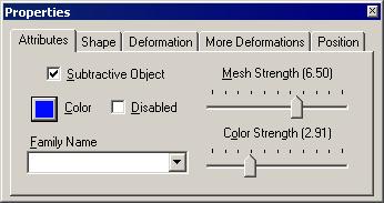 Окно Properties объекта одно из самых важных в Organica. Когда все примитивы расположены в окнах проекций, им предан нужный размер, остается возможность более тонкой настройки. Эти скрытые до поры до времени опции прячутся в окне Properties, которое вызывается тремя разными способами: нажатием кнопки Enter при выделенном объекте, двойным щелчком на объекте или кнопкой F7. В окне Properties находится пять панелей: Attributes, Shape, Deformation, More Deformation и Position.