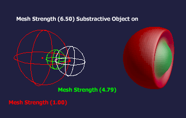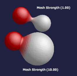 Mesh Strength слайдер определяет насколько сильно проявляется себя данный метабол при реакции с другими метаболами. Наиболее выпукло это смотриться на приведенной иллюстрации. При параметре Mesh Strength равном нулю метабол выключается из взаимодейсвия с другими метаболами, то есть равен отмеченной опции Disabled.