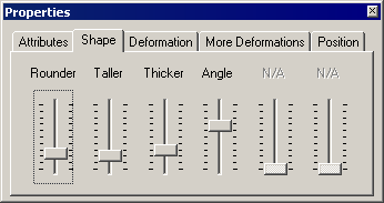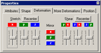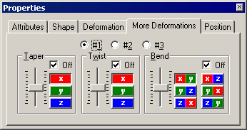 Панели Defomation и More Deformation позволяют исказить форму метабола командами Stretch, Shear, Taper, Twist и Bend. Стоит обратить внимание, что на панелях деформаций оси обозначены тремя разными цветами, соответствующими раскраске выделенного объекта. Это, бузусловно, весьма облегчает ориентирование. Копка Resenter возвращает метаболу его неискаженную форму.