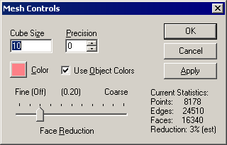 Заключительный этап процесса моделирования – экспорт готового меша в удобочитаемый формат. Для этого надо поэксперементировать с окном Mesh Controls. Cube Size устанавливает размер ячейки. Чем больше это значение, тем более грубым будет результирующий объект. Precision регулирует насколько точно будет происходить обтяжка метаболов полигонами. Опция Use Object Colors позволяет получить разноцветный объект, основанный на цветах отдельных метаболов, но эту возможность имеет смысл использовать только при экспорте в .IOB. Можно оставить опцию Use Object Colors выключенной и в этом случае весь объект будет цвета кнопки Color. Face Reduction слайдер управляет оптимизацией модели посредством уменьшения количества фейсов.