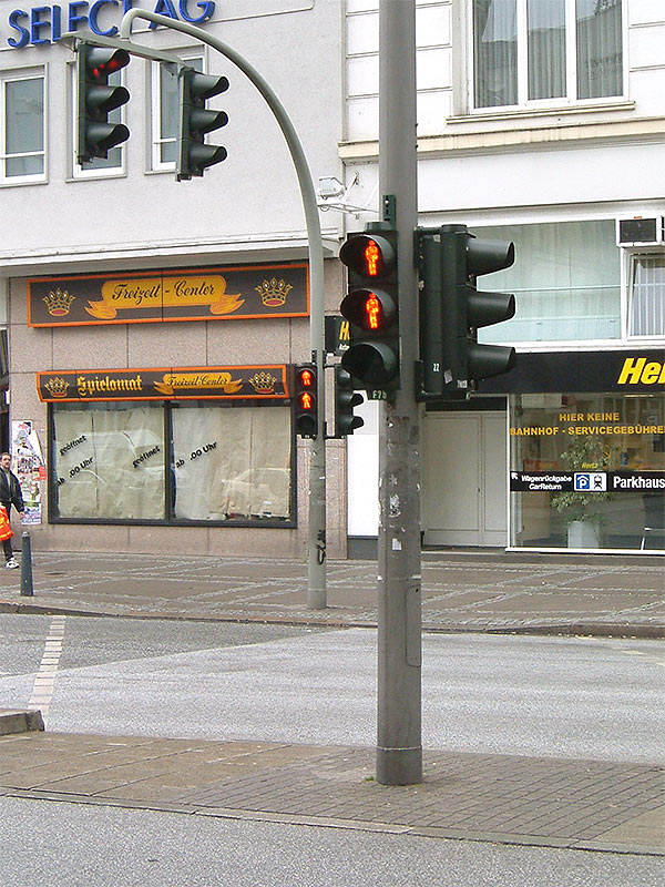 Я тоже удивился светофорам с двумя красными человечками, увидев их в эту субботу на перекрестке в Таллине. Также в Таллине имеются такие светофоры, которые указывают на дорогу велосипедистам, так вот на них нарисована крупная стрелка вверх и под ней велосипед – с далека эта композиция выглядит весьма вульгарно :)