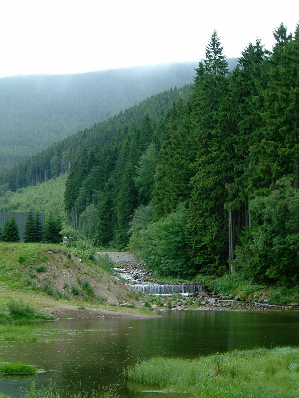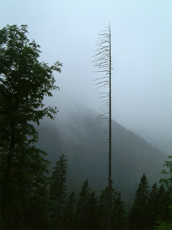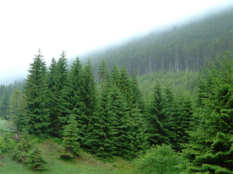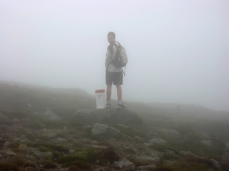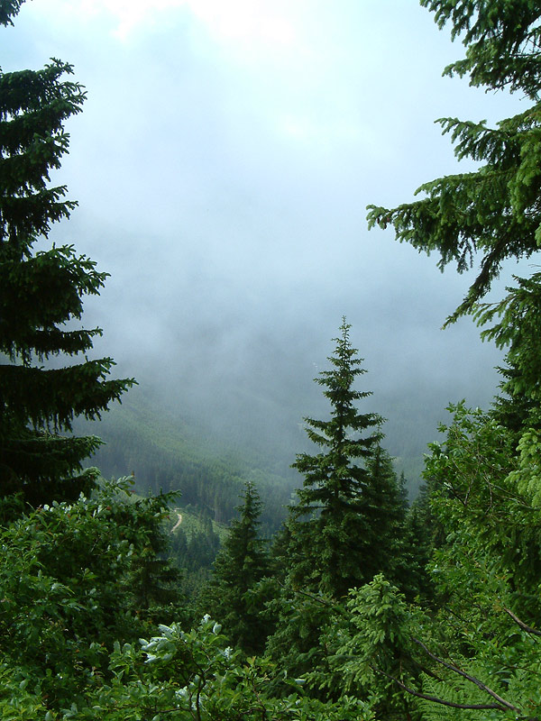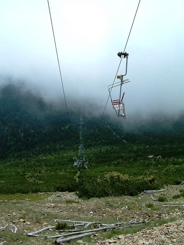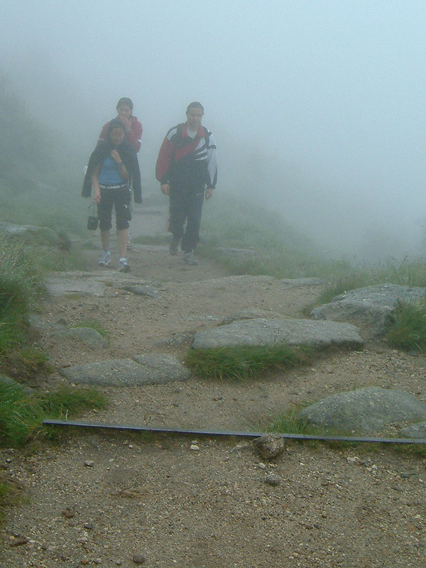 Утром следующего дня погода изменилась кардинально — накрапывал дождь, стало прохладно. Точка, с которой мы начали восхождение, находилась на высоте 700 метров. Я взял с собой фотоаппарат и бутылку воды. Мы миновали туристическую прогулочную и велосипедную зоны и скоро тропинка начала довольно круто забирать вверх. Из-за опасности эрозии полотно тропы было во многих местах укреплено железными уголками и выложено камнями. Через пару часов мы нырнули в облака. Группа стала растягиваться — более выносливые, сами того не замечая, уходили вперёд. Вода начала подходить к концу. Слоёный туман стекал по склону горы, чтобы нырнуть в пропасть, у которой не было видно дна. Разговоры смолкли. За 4 часа мы поднялись на 800 метров. Тропинка расширилась до открытого пространства размером с футбольное поле. Из тумана выступало жёлтыми стенами кафе, а невысокие бетонные столбики у обочины сигнализировали о том, что мы находимся на государственной границе с Польшей. В кафе удалось согреться и просохнуть, а так же подивиться грабительским ценам. Туалет был платный, так что желающие справить нужду попросту отходили ненадолго в туман. Невероятно остроумным показалось орошать и удобрять территорию Польши с территории Чехии, балансируя на пограничном столбике.