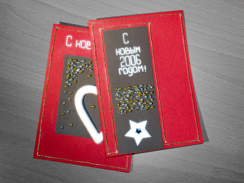 Новогодние открытки Красный и серый картон, золотая нить, пенопласт, серебряный фломастер и другое. Новогодние открытки